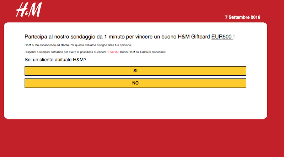 Il testo è il seguente: Partecipa al nostro sondaggio da 1 minuto per vincere un buono IKEA Voucher EUR500 ! IKEA si sta espandendo ad Rome.Per questo abbiamo bisogno della tua opinione. Rispondi 4 semplici domande per avere la possibilità di vincere 1 dei 150 Buoni IKEA da EUR500 disponibili! Sei un cliente abituale IKEA?”. Seguono i tasti Sì e No su cui il malcapitato può cliccare passando alla domanda successiva. Dopo un finto questionario sulle abitudini di acquisto della persona, il sito finge di elaborare le risposte e poi rimanda a una schermata dove ci si congratula per la vittoria di un voucher da 500 euro da spendere presso Ikea. La condizione per riceverlo è condividere la pubblicità con 10 contatti presenti nella propria rubrica, e inserire il proprio nome e cognome e la propria mail.