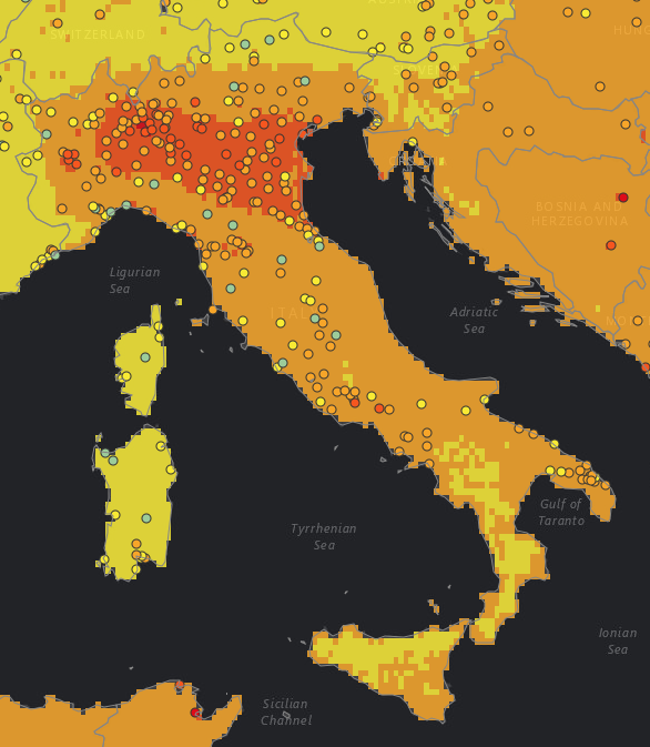 Secondo l’Oms, i livelli massimi di concentrazione di polveri sottili Pm2.5 “consigliati” per evitare problemi alla salute devono stare entro i 10 microgrammi/m³. In Italia, i livelli concentrazioni Pm2.5 sono ben al di sopra di questa soglia in molte zone. Le stazioni di rilevamento segnate con il rosso sulla mappa, con un livello di polveri sottili superiore a 70 microgrammi/m³, sono la zona di Milano e Monza, Brescia, caratterizzati da alta concentrazione di traffico di mezzi e emissioni industriali. A livello allarmante anche la zona di Firenze, Genova, Ceccano nel basso Lazio (zona molto trafficata e dove si concentrano varie fabbriche), e in generale tutta la pianura padana. La regione meno inquinata risulta essere la Sardegna con livelli medi tra gli 11 e i 15 microgrammi/m³
