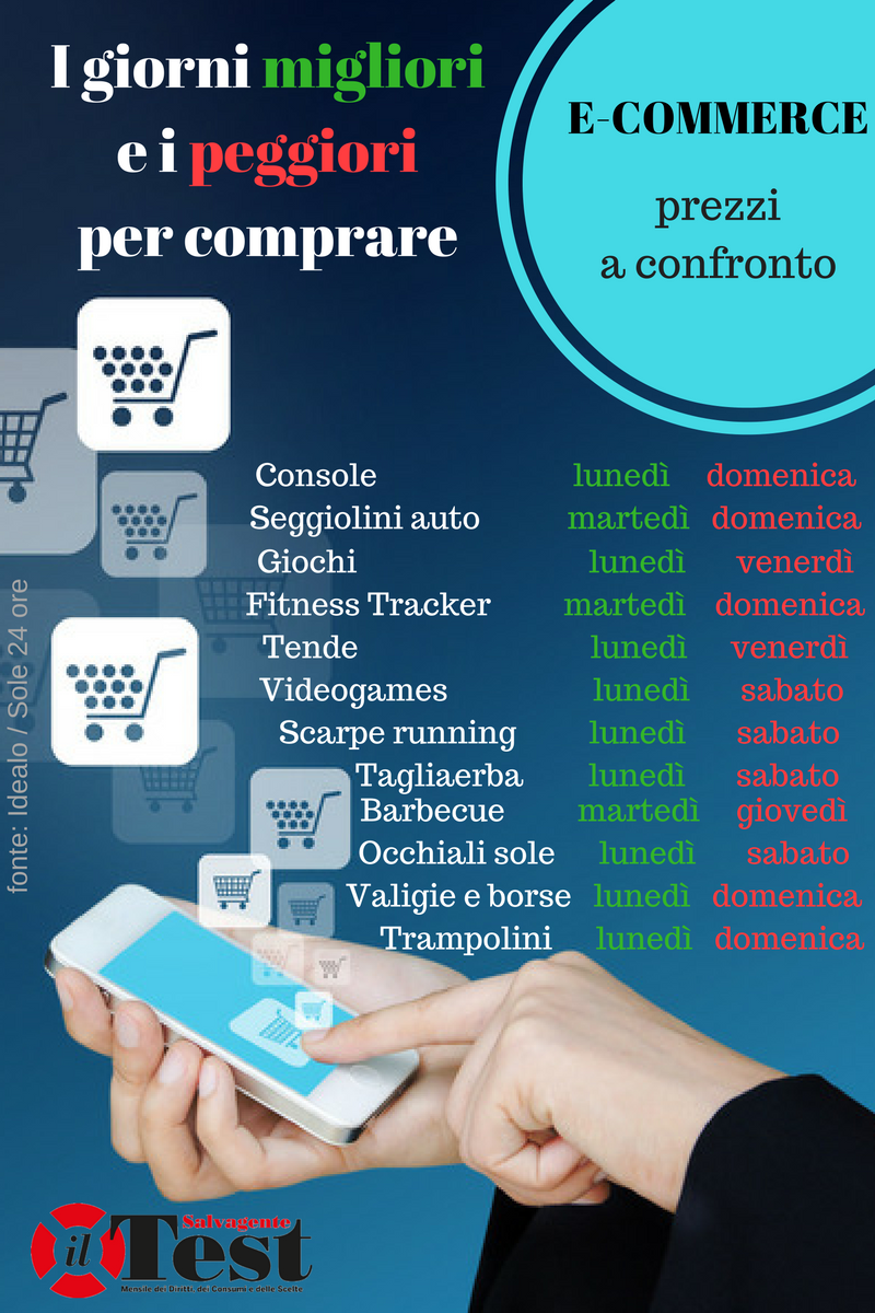 Le ragioni di questa variazione sono dovute alla capacità degli shop online di tracciare tramite i cookie le pagine visualizzate dagli utenti nel corso della settimana. In genere, infatti, lo zapping tra un sito e l’altro per confrontare modelli e prezzi avviene durante i giorni feriali, ma l’acquisto vero e proprio viene lasciato al weekend quando si ha più tempi libero e la mente più fresca per procedere con la scelta finale e il conseguente click dell’acquisto. I portali, tracciando le preferenze degli utenti nei giorni precedenti, aumentano i prezzi dei prodotti più desiderati, in base alla loro popolarità, in prossimità del fine settimana. Idealo ha confrontato dodici categorie: videogame e console, giochi, valigie e borse, sediolini per auto e tende da campeggio, occhiali da sole e fitness tracker, tosaerba e barbecue, trampolini, e scarpe running. Di ogni categoria ha indicato il giorno della settimana più conveniente e quello più caro per l’acquisto del prodotto. In ogni caso, 11 prodotti su 12 sono risultati più economici il lunedì rispetto alla domenica.