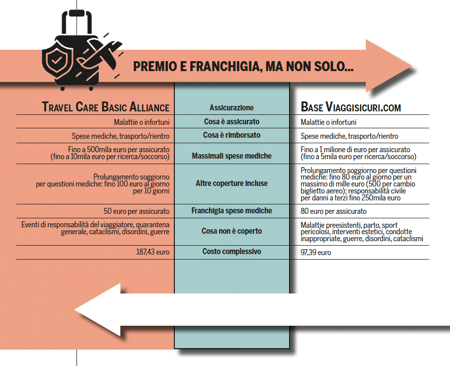 Proporzione che si ribalta sulla copertura delle spese per eventuale soccorso – immaginiamo una gamba rotta in una zona non facilmente accessibile – e che va a vantaggio di Alliance per quanto riguarda la franchigia entro cui l’esborso va pagato di tasca proprio (50 euro contro 80 di Viaggisicuri). Su altre voci, come le coperture in caso di soggiorno prolungato a causa della malattia, le cifre sono paragonabili, e tra le coperture ulteriori spicca la responsabilità civile coperta fino a 250mila euro per danni a terzi, prevista solo da Viaggisicuri.com.
