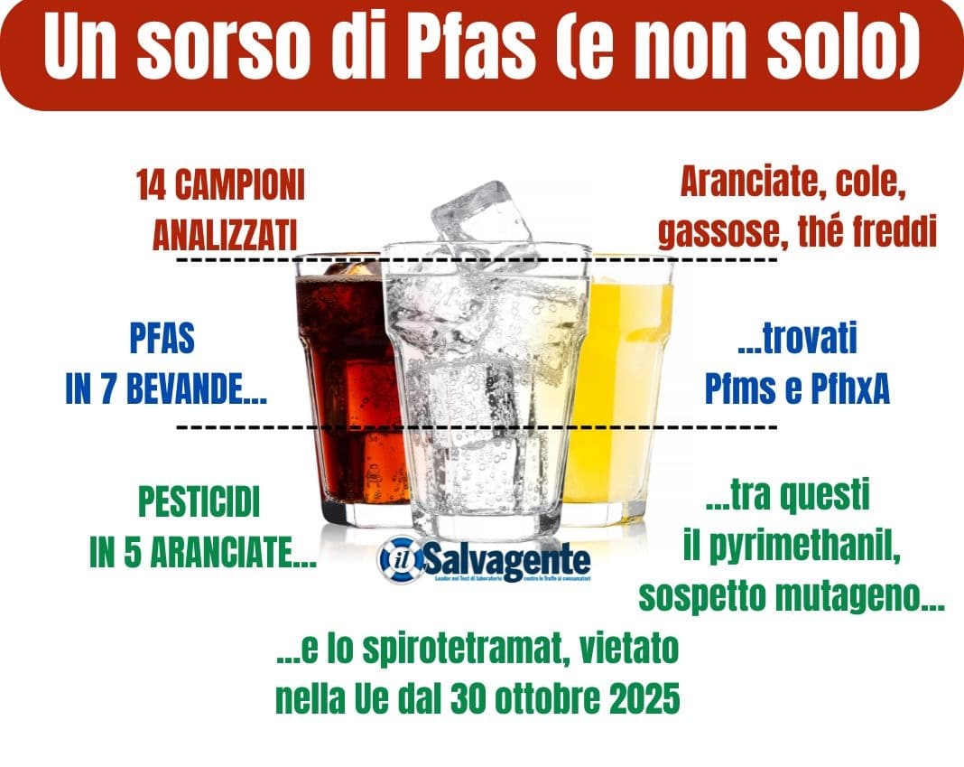 Nel numero di agosto, Il Salvagente pubblica i risultati dei test di laboratorio in cui su 14 campioni di soft drink, ben 7 riportano tracce di Pfas. Sono due le sostanze rilevate: Pfhxa (acido perfluoroesanoico) e Pfms (acido trifluorometansolfonico).