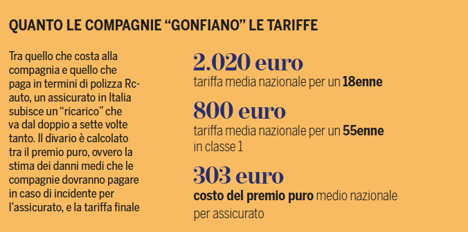 Le tariffe “finite”, però, sono ben più salate: una polizza media per un 18enne è di 2020 euro (quasi sette volte il premio puro) e per un 55enne in classe 1 è di 800 (più del doppio del costo preventivato dalla compagnia). Come si giustifica questa lievitazione di cifre?