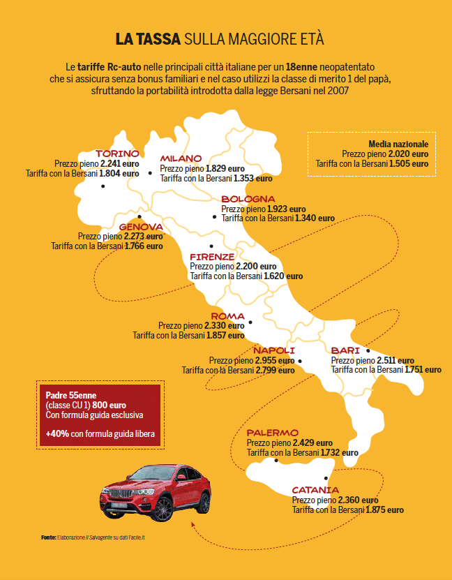 Il tema è approfondito nel numero in edicola del Salvagente (acquista qui la copia in digitale) e mette in evidenza – come mostra la tabella più in basso – l’elevato costo che si trova di fronte una famiglia per pagare la prima assicurazione a un 18enne neopatentato. Secondo le stime di Facile.it per il Salvagente il premio medio nazionale per un neopatentato che non beneficia della Rc familiare ammonta a 2.020 euro, cifra troppo elevata per molti giovani e famiglie italiane. Ci sarebbe la possibilità, grazie alla legge Bersani, di ereditare la Classe universale di merito (Cu) da un familiare convivente, magari la classe 1 del papà. In teoria, questo consentirebbe di abbattere i costi, portandoli intorno ai 1.505 euro su base nazionale ma in ogni caso non basta a rendere meno gravoso il costo di una polizza assicurativa. Il motivo? Le compagnie assicurative nel tempo per depotenziare la riforma Bersani hanno rivisto i parametri per costruire la tariffa facendo pesare la classe di merito e invece aumentando il valore dell’età anagrafica e della provincia di residenza. I risultati sono sotto gli occhi di tutti.