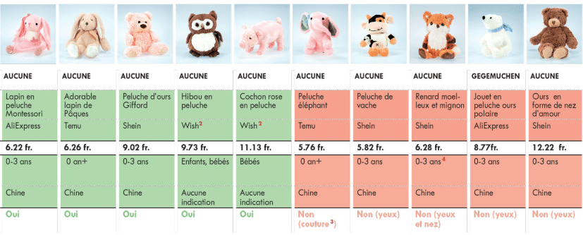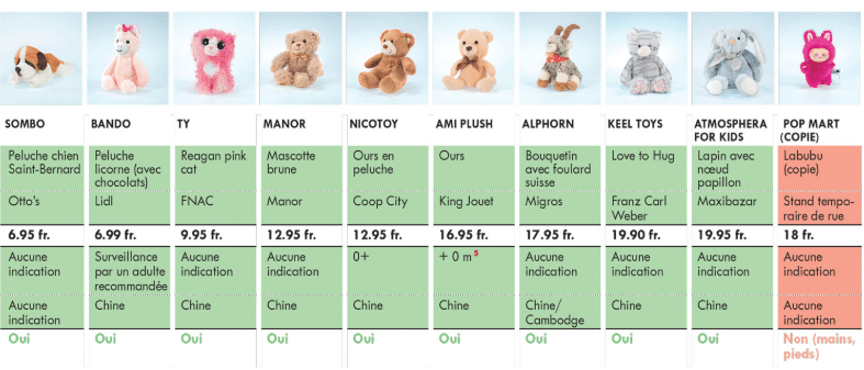 I peluche sono stati testati da un chimico secondo la norma svizzera SN EN 71-1. La resistenza di occhi, naso e cuciture è stata verificata simulando la forza di un bambino piccolo: 6 peluche su 20 hanno mostrato pericoli concreti di soffocamento.