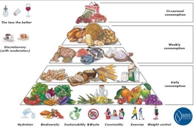 A saltare agli occhi è la differente forma della nuova piramide alimentare, che, rispetto a quella tradizionale, appare rovesciata, con il vertice verso il basso. Un altro importante cambiamento, come anticipato, è rappresentato dal fabbisogno proteico, pari a 1,2-1,6 g/Kg di peso corporeo/die, superiore a quello raccomandato dalle Linee guida italiane di 0,9 g/Kg di peso corporeo/die.