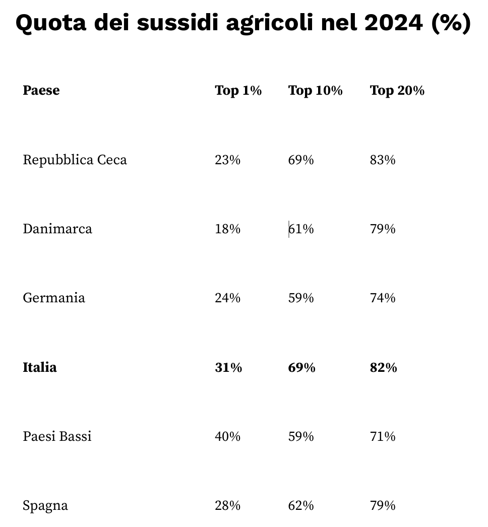 Nei sei Stati membri considerati, due terzi dei fondi vengono destinati in media al 10% più ricco, mentre circa l’80% dei sussidi si concentra nelle mani del 20% più benestante. Nei Paesi Bassi, in particolare, si registra la concentrazione più elevata, con l’1% più ricco dei beneficiari che riceve il 40% dei sussidi Pac. Il nostro paese risulta in linea con questo trend o leggermente sopra la media, considerato che in Italia lo scorso anno il 31% dei fondi erogati è finito nelle tasche dell’1% più ricco dei beneficiari, il 69% al 10% e l’82% al 20% dei più ricchi.