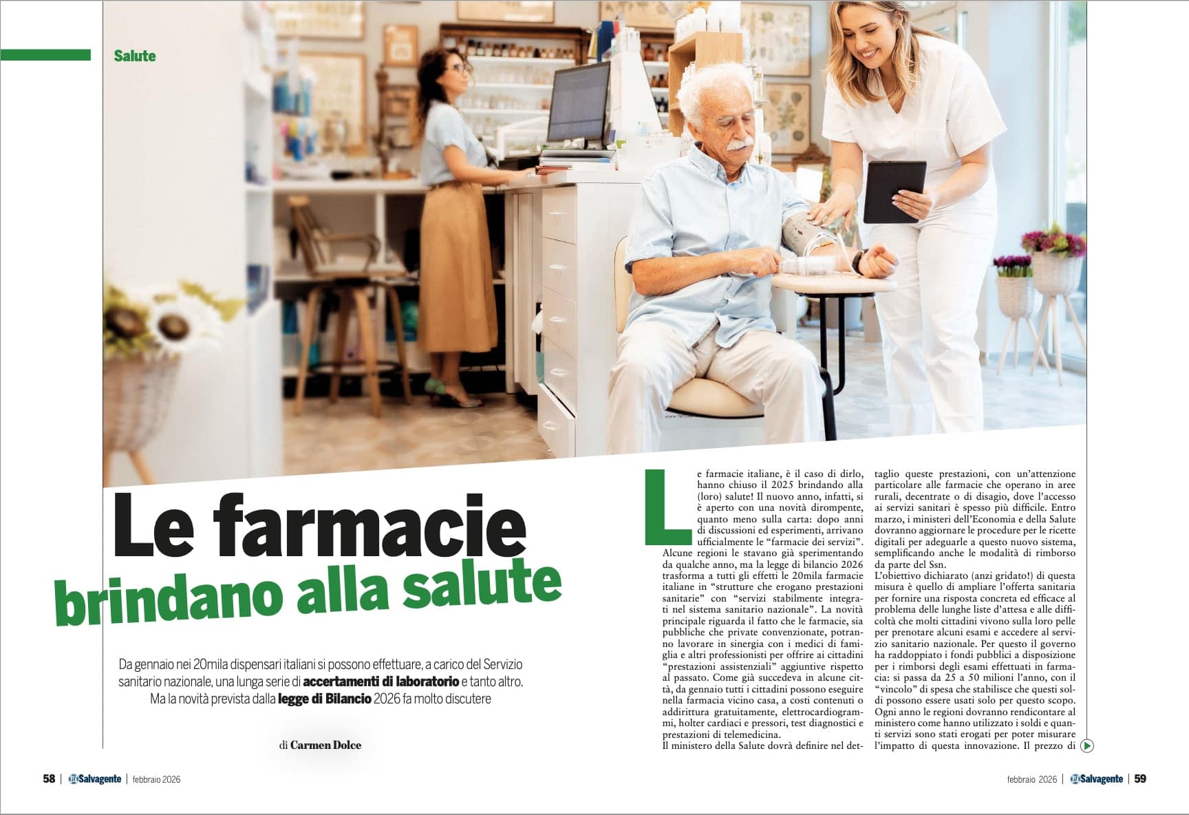 farmacia. Sul numero di febbraio del Salvagente, in edicola da venerdì scorso e acquistabile anche online, abbiamo ripercorso sulla la vicenda nel servizio “Le farmacie brindano alla salute” dove si fa un excursus sulla legge di Bilancio 2026 che ha permesso alle 20mila farmacie presenti in Italia di offrire ai cittadini una serie di esami e accertamenti di laboratorio, a carico del Servizio sanitario nazionale, ottenendo peraltro un rimborso maggiore (per singola prestazione) rispetto a quello riconosciuto a laboratori, ambulatori e agli stessi ospedali.