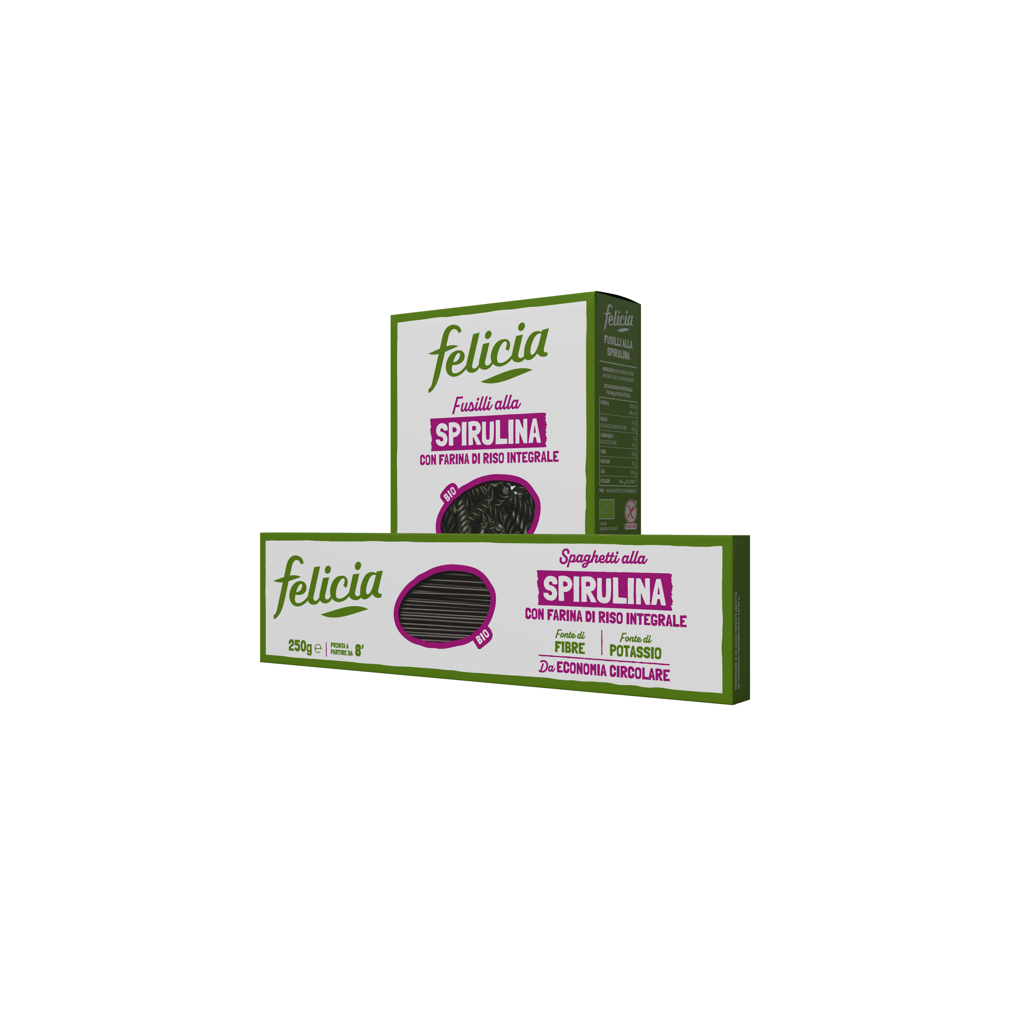 Tra le più recenti innovazioni di prodotto lanciate sul mercato, la pasta Felicia alla Spirulina, disponibile in due formati spaghetti e fusilli, è a base di farina di riso integrale e Spirulina K Biologica prodotta naturalmente da ApuliaKundi. Questo prodotto è una fonte di fibre, ferro e, potassio.