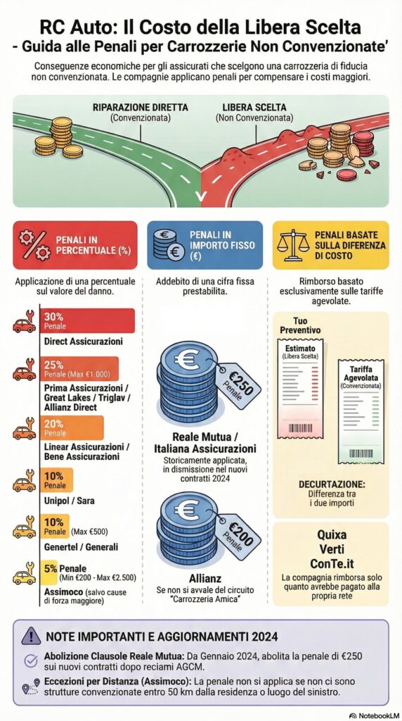 Chi sottoscrive la clausola “Riparazione diretta” di Unipol o Linear (compagnia “diretta” del gruppo) e opta per il carroziere di fiducia per la riparazione, riceverà un indennizzo decurtato – rispettivamente – del 10 e del 20% anche potendo subire l’azione di recupero del credito. Generali e la sua “on line” Genertel con la condizione contrattuale “Risarcimento in forma specifica” penalizzano la libera scelta dell’officina con un taglio del 10% “del danno risarcibile con il massimo di 500 euro“. Se la clausola “Ripara Ok” di Sara assicurazioni prevede una decurtazione del 10% del danno se non si usufruisce della rete convenzionata di officine, la “Formula Express” di Reale Mutua è stata “cancellata” sui nuovi contratti dal gennaio 2024 dopo che – guarda caso – Movimento consumatori è ricorsa all’Antitrust. Tuttavia nei “vecchi” contratti Rc-auto prevede una riduzione di 250 euro sull’indennizzo previsto qualora la riparazione venga effettuata in una carrozzeria non convenzionata.