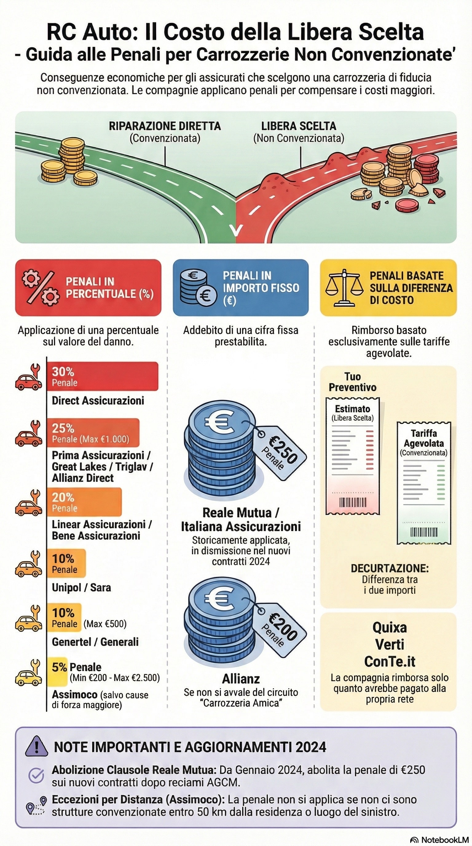 C’è poi chi, come Quixa, ConTe e Verti, confrontando i preventivi di spesa tra quello della carrozzeria convenzionata e quella scelta liberamente dall’assicurato, risarcisce solo l’importo più basso, in genere quello del circuito convenzionato.