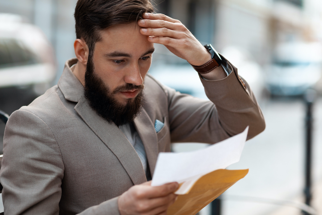 Big debt alert. A shocked man reads a court letter. Death of a loved one, increased mortgage payments.