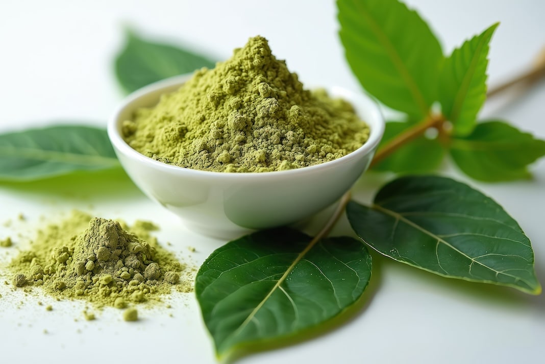 Close-up of kratom leaves and powder, derived from Mitragyna speciosa, a tropical evergreen tree. Natural herbal supplement, used for wellness, dosage, effect, properties.